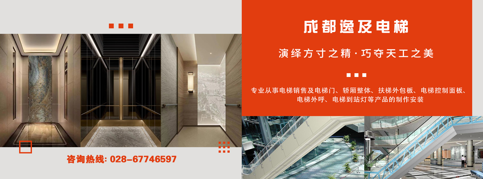 成都市逸及电梯有限公司专业从事电梯销售、电梯门、轿厢整体、扶梯外包板、电梯控制面板、电梯到站灯及各种高端金属精品的制作安装;并承接所有不锈钢装饰工程及其他金属制品的生产加工,配备有剪、折、冲、压、激光、刨槽等钣金设备,并成功的参与多间高档写字楼及酒店、会所的不锈钢配套工程。不断提供优质的产品和服务,真诚的欢迎各地的朋友来我公司洽谈业务。我们愿与新老客户本着精诚合作、互惠互利的原则建立广泛的合作...